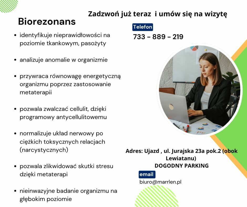 Zapraszam do skorzystania z usług biorezonansu.Jest to forma medycyny alternatywnej. Każdy nasz organ i każda komórka w naszym organizmie emituje fale elektromagnetyczne o określonej, charakterystycznej dla siebie częstotliwości. Te "zdrowe" częstotliwości w naszym ciele mogą ulec zakłóceniu w przypadku choroby lub dysfunkcji, co prowadzi do zmiany emitowanych fal. Również patogeny takie jak bakterie i wirusy, glisty itd. emitują określone fale , które są skanowane przez urządzenie. Przy zastosowaniu określonych fal o określonych częstotliwościach giną.